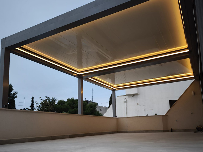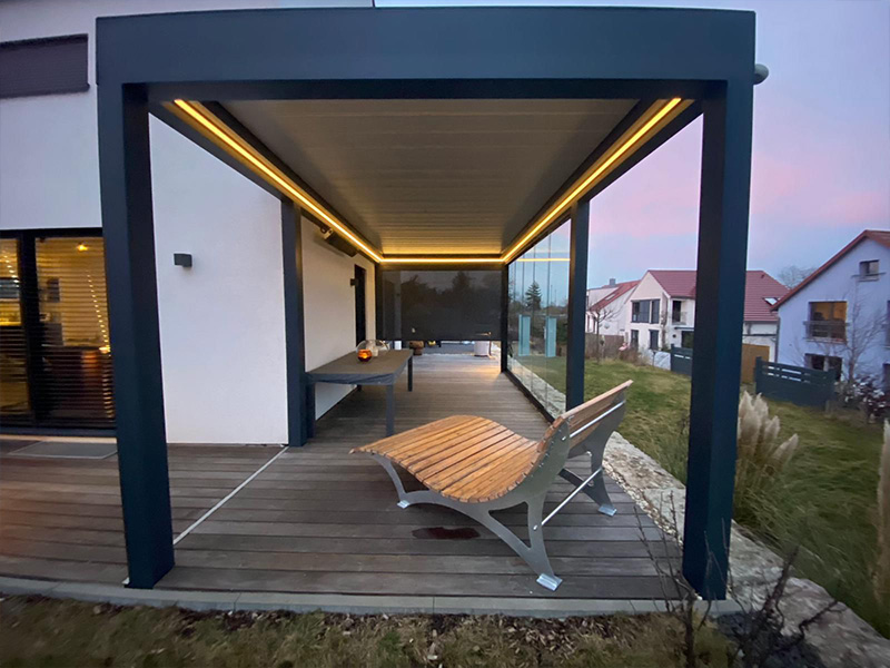 Bioklimatik Pergola, hava şartlarına bağlı olarak ayarlanabilen, motorlu lamellerden oluşan modern bir gölgelendirme sistemidir. Lameller, pergolanın üst kısmında bulunur ve yatay olarak hareket eder. Bu lamelleri açarak güneş ışığının içeri girmesini sağlayabilir, ya da kapatarak tam gölge elde edebilirsiniz.